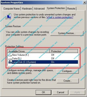 Gördüyümüz kimi qorunmaya açiq (on) və qapalı (off) disklər mövcuddur. Susmaya görə (default olaraq) ƏS-nin yazıldığı disk həmişə qorunmaya açıqdır və bu da o deməkdir ki, sitemdə dəyişiklik baş verdiyi zaman geriye dönüş nüqtələri(Restore Points) avtomatik olaraq yaradılır. C diskini qeyd edib Configure hissəsinə keçək.