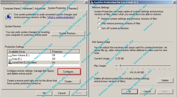 C diski ƏS-nin yazıldığı disk olduğuna görə “Restore system settings and previous versions of files” seçilmişdir. Bu halda həm sistem tənzimləmələri(system settings), həm də C diskində olan fayllar üçün geriyə dönüş nöqtələri yaradılır. Digər ƏS-i olmayan diskləri seçdikdə “Only restore previous versions of files” seçə bilərik. Disk Spase Usage hissəsində Restore Points-lər üçün lazım olan qədər həcm(Gb) ayırırıq. Göstərdiyimiz həcm dolduqca köhnə Restore Pointlər avtomatik silinir.