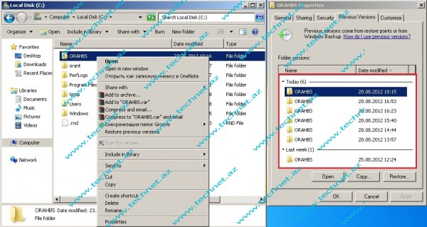 Yazdıqlarımızı daha yaxşı anlamaq üçün C diskində yerləşən ORAHBS qovluğunun üzərində mouse-un sağ düyməsin sıxıb Properties-i seçək və açılan pəncərədə Previous Versions hissəsinə keçək.