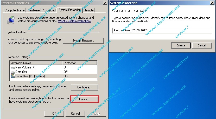 System protection pəncərəsində Create edərək özümüz istədiyimiz vaxt (manual olaraq) Restore Point nöqtəsin yarada bilək.
