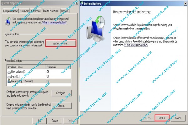 System protection pəncərəsində System Restore etsək avtomatik və ya manual olaraq yaradılmış sistem ayarlarını geri qaytarmış olarıq. Buna aşağıdakı nümunə ilə baxaq.