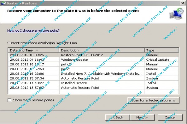 ƏS-də avtomatik və manual olaraq yaradılmış geriyə dönüş nöqtələrini görürük. Buradan bizə aydın olur ki, nə vaxt və hansı prosesdən sonra geriyə dönüş nöqtələri yaradılıb. İstədiyimiz vaxtda olan geriyə dönüş nöqtəsin qeyd edib ƏS-mimizin daha uğurlu hesab etdiyimiz anına geri qayıdırıq.
