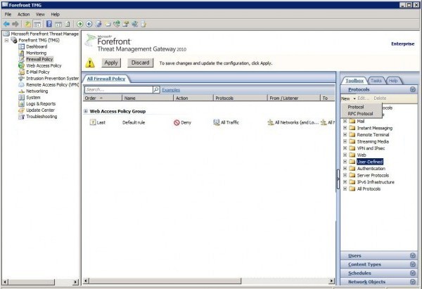 TMG-də Firewall Policy-nin Toolbox hissəsində NEW -> Protocol deyərək davam edirik.