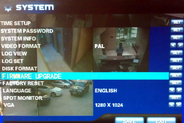 System bölümündə isə Time Setup-dan saatı nizamlayır, System Password-da DVR-ın nizamlamalarına və çəkilişlərə baxa bilmə üçün şifrə təyin edirik, Video Formatı PAL olaraq tənzimləyirik. Dəyişiklikləri SAVE düyməsini basmaqla yaddaşa verir, şəbəkə kabelinin taxılmasına əmin oluruq və sistemi yenidən başladırıq.