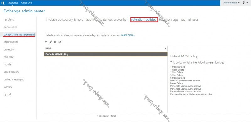 “Retention policies” sayəsində bir mail qutusunda olan bəzi obyektlərə saxlama qaydaları tətbiq edə bilirik. Yəni bu qaydanı tətbiq edərək mail qutusunda olan obyektlərin nə zaman silinəcəyini və ya nə zaman arxivə göndəriləcəyini təyin edirik. Bu qaydalar mail qutularının həddən artıq dolmasından və lazımsız maillərin maneələrindən Bizləri qoruyacaqdır.
