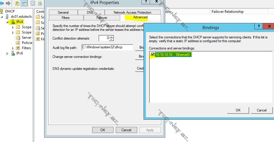 O zaman belə bir şey edək. İlk öncə DHCPni silin, sonra müvəqqəti VViFi şəbəkədə olan NİC`i söndürün və kompüteri restart edin.Daha sonra DHCP tənzimləməsi edin. İP`lər normal olduqdan sonra disable etdiyiniz NİC`i yandırın. Əgər, ehtiyac olsa, İPv4-Properties-Advanced-Bindingsdən ayağı göstərin.