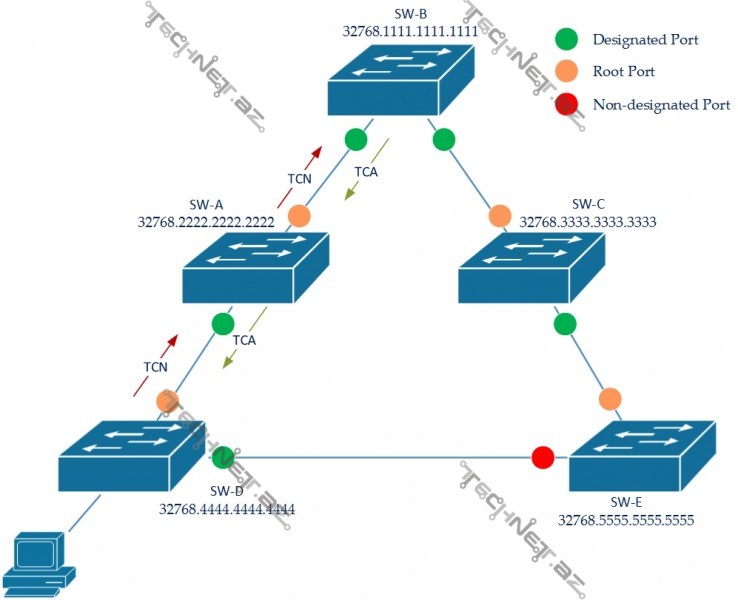 Aşağıdaki şəkildə kompüter qoşulduqda SW-D tərəfdən həmin proses başlayır. Maraqlısı odur ki, burada hansı dəyişiklin baş verdiyi söylənilmir, yəni Root Bridge sadəcə dəyişikliyin olduğu barədə məlumatlanacaqdır, konkret olaraq hansı switch-də nəyin dəyişdiyi barədə deyil.