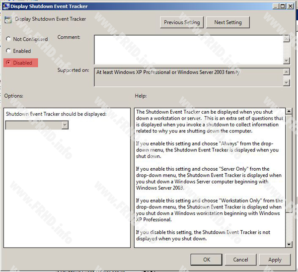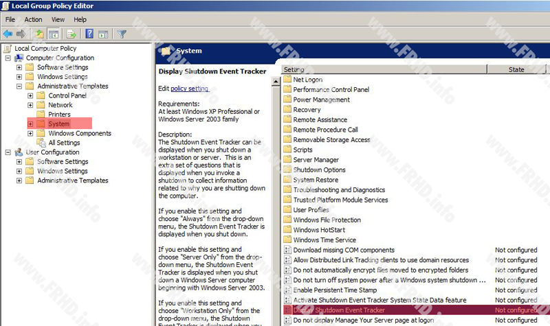 Computer Configuration—Administrative Templates—System və buradan Display Shutdown Event Tracker`I seçib, üzərinə 2 dəfə sıxırıq.