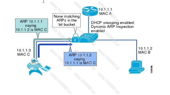 DAİ-Dynamic ARP İnspection-ARP yaddaşın dəyişdirilməsi bir neçə problemə yol açır. Bunu qarşısını almaq ümün switch özünün təsdiqləmə mexanizmindən istifadə edir k, arp request-in doğru mənbədən gəlməsini təyin etsin.