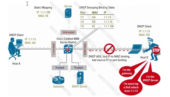 DHCP-snooping saxta dhcp serverlərdən qorunmaq üçündü. O etibarsız host və dhcp serverlər arasında loqiki firewall yaradır. Switch dhcp binding bazasını yaradır və həmin bazaya əsasən saxta və etibarsız mesajları təyin edir. Həmçinin bazada dhcp serverin verdiyi adreslərin hansı portlarda istifadə olunması və kimə məxsusluğuda öz yerini tapır. Saxta paket porta daxil olarkən switch bazaya baxıb təyin edir ki, bu mesaj inanılmış hostdan gəlir və ya saxtadı.