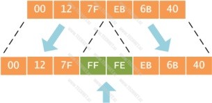 Birinci mərhələdə 48 bitlik MAC adres 64 bitə çevrilir. Bunun üçün MAC adresi iki 24 bit hissəyə bölünür və həmin iki hissə arasına 16 bitlik 0xFFFE daxil edilir. Və nəticədə 64 bitlik adres alınır: