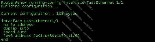 Static configuration – adından göründüyü kimi İPv6 adres statik təyin olunur. Misal olaraq router-də 2001:DB80:CD30::1/60 adresin statik konfiqurasiyaya baxaq: