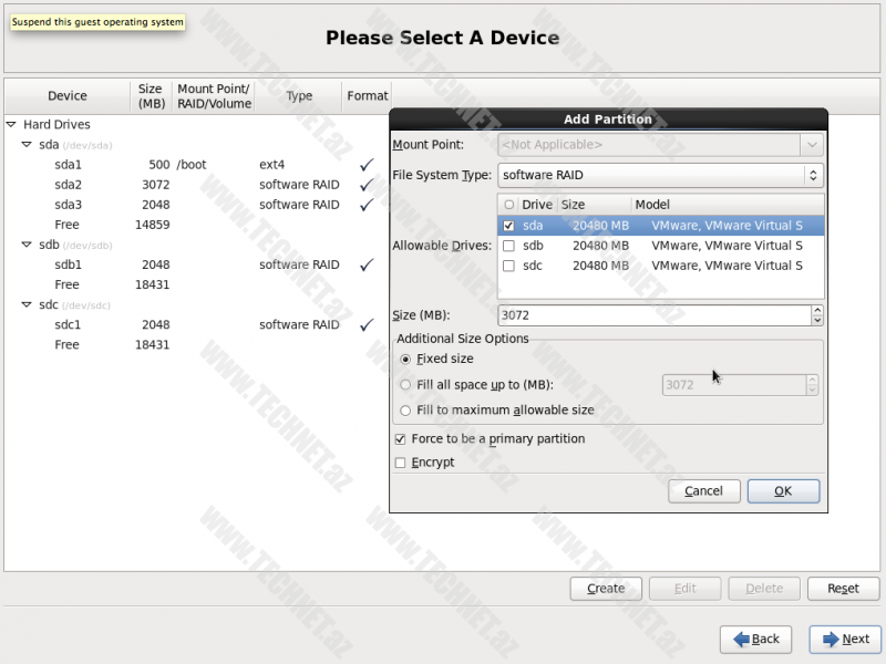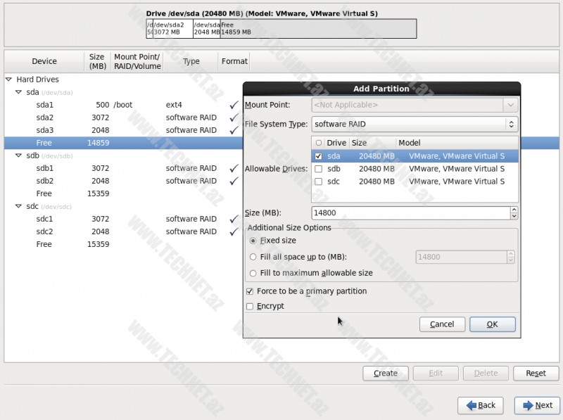 Birinci diskin üzərində 2048 mb’lıq raid partition düzəldirik. Sonra yenidən 3072 mb’lıq raid partition düzəldirik. Və bir ədəd daha 14800 mb’lıq raid partition düzəldirik. Deməli bizim bir diskimizin üzərində 3 ədəd raid partition oldu. Bu ardıcıllığı növbəti hər iki diskin üzərindədə tətbiq edirik.