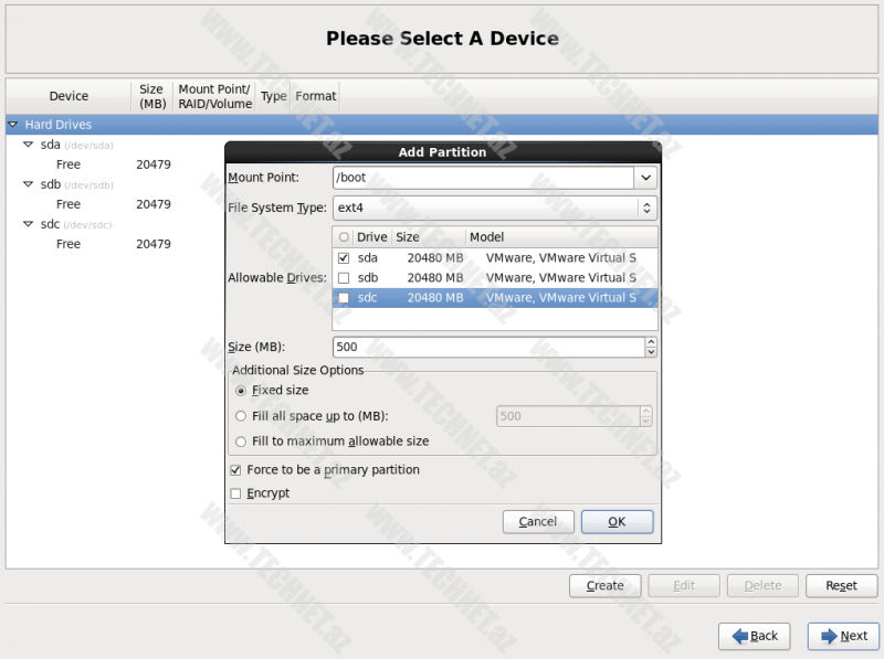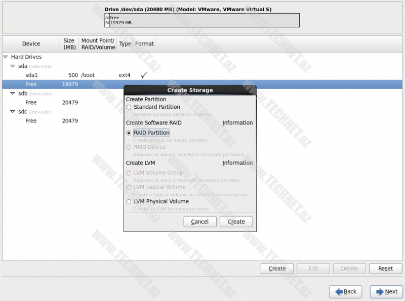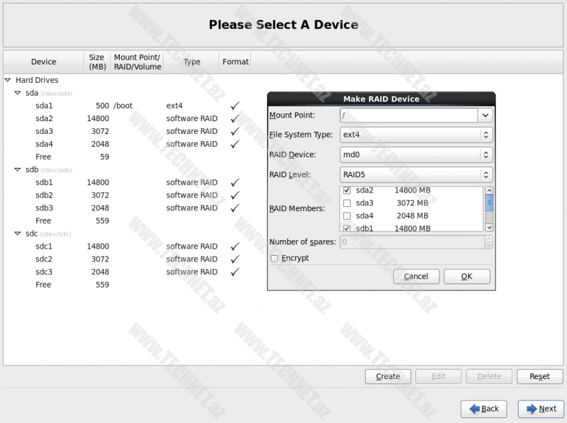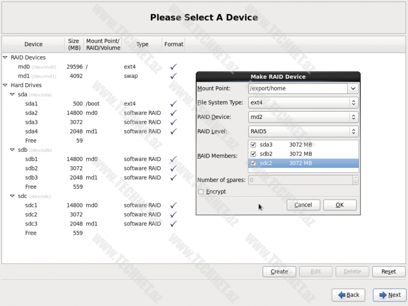 Mount Point / göstəririk, file system ext4, raid device md0 və raid səviyyəsini RAİD5 seçirik. RAİD Members hissəsində eyni həcmli sda,sdb,sdc disklərini seçirik və OK edirik.