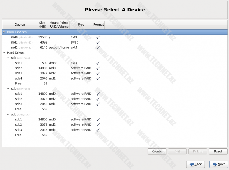 Beləcə 3 diskimizin üçüdə eyni həcmli hissələrə bölünmüş oldu. Yenə create düyməsinə basırıq və RAID Device seçib create edridik.