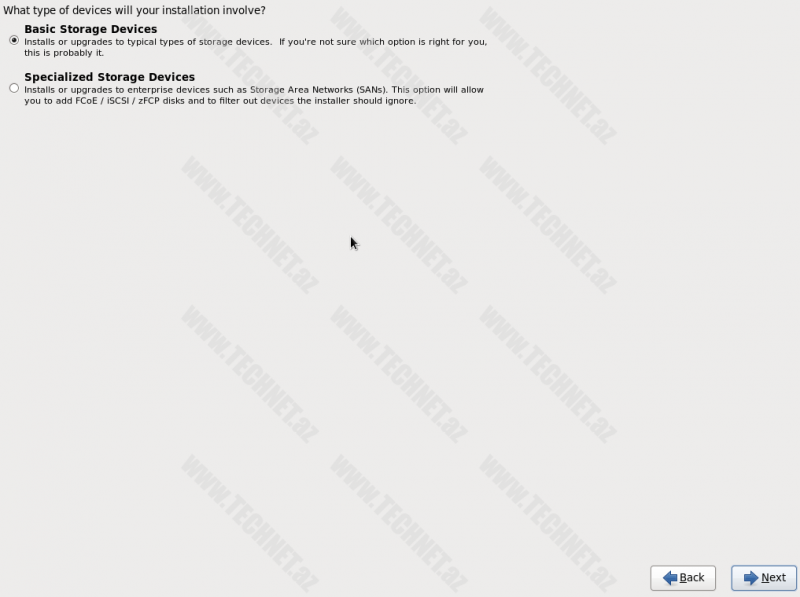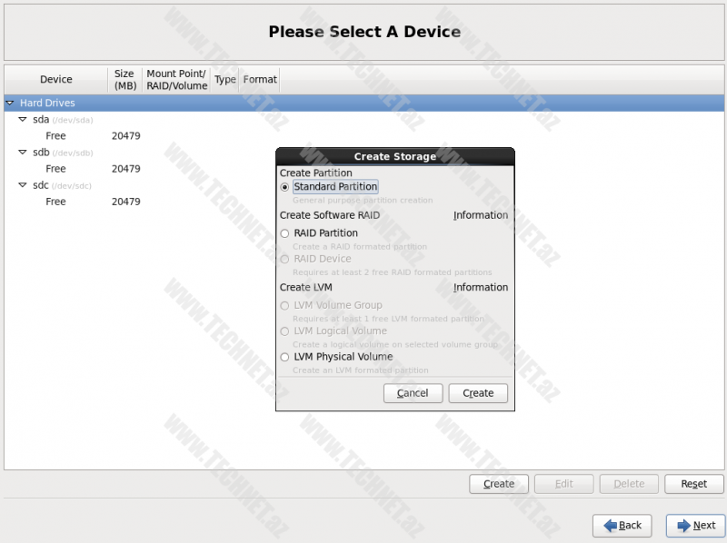 Create Custom Layout seçirik və Next etdikdən sonrakı pəncərədə qarşımıza 3 seçənək gəlir. Standart Partition, RAİD partition və LVM Phisical Volume. Biz ilk növbədə Standart Partition seçirik ki, bir ədəd “/boot” partition düzəldək. Çünki boot partitionı raid üzərində qurmaq olmaz.