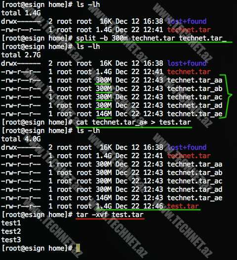 Aşağıdakı şəkildə baxaq. Bizim 3 ədəd faylımız var (test1, test2, test3). Bunları ilk növbədə tar’layıb, birləşdirib technet.tar adlı bir fayl edirik. Sonra onu split komandası ilə 300mb’lıq hissələrə bölürük.