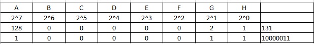 A,G,H dəyərlərinin 10-luq say sistemində qarşılıqlarını “1” olaraq alırıq, B,C,D,E,F dəyərlərinin 10-luq say sistemində qarşılıqlarını “0” olaraq alırıq. Bu vəziyyətdə 128+0+0+0+0+0+2+1=131 rəqamsal dəyərini əldə edirik. Bu ifadənin 2-lik say sisteminə görə qarşılığını tapmaq üçün də A,G,H dəyərinin oktet qarşılıqları “1” alarkən B,C,D,E,F dəyərinin oktet qarşılğını “0” alırıq.