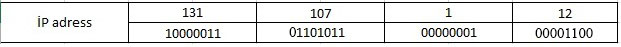 Eyni hesaplamanı 131.107.1.12 ip adresinin 2-lik say qarşılığını tapmaq məqəsdi ilə aparmağımız üçün İP adresin hər okteti üçün yuxarıdakı şəkildə hesablama aparmağımız gərəkir. Bu halda 131.107.1.12 ip adresinin 2-lik say sistemində bit olaraq qarşılığını aşağıdakı kimi tapmış oluruq.
