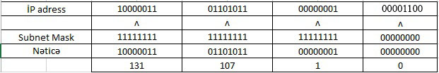 İP adres və Subnet mask arasında edilən hesablama əməliyyatı nəticəsində kompyuter şəbəkə İP-ni əldə edə bilərik. Bu əməliyyat məntiqdə və(and) olaraq adlandırılır və “ʌ” ilə işarəsi ilə göstərilir.