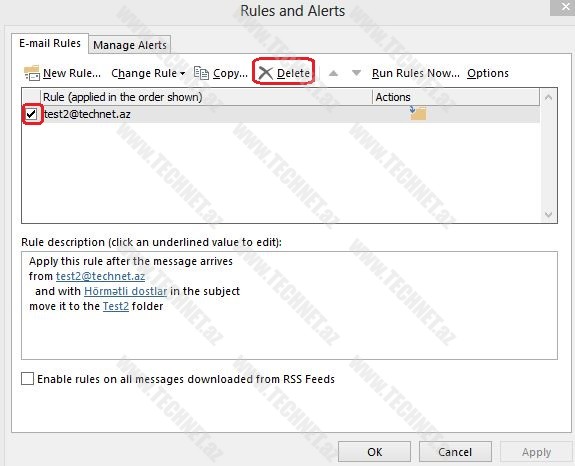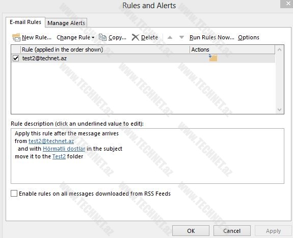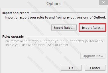 Yenidən File –> Rules and Alerts –> Import Rules deyərək saxladığımız faylı göstəririk.