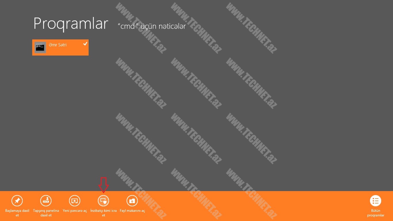 ƏMR SƏTRİ-ni İnzibatçı kimi (Run as Administrator) başladırıq. (Şəkil Windows 8-dən götürülüb, aşağı versiyalı ƏS-lərində Sağ düymə ilə Run as Admin deyirik)