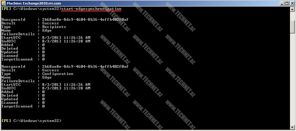 İki server arasında sinxronizasiyanı başlatmaq üçün “EMS” (Exchange Management Shell) -də “start-edgesynchronization” əmrindən istifadə edirik.