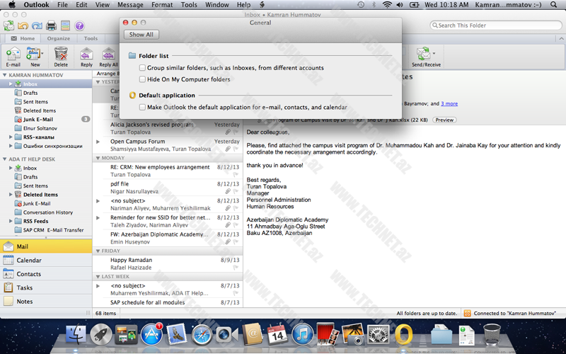 Ekranimizin sol yuxarı hissəsində Outlook yazısına tıklayırıq və ya (klaviyaturamızda cmd+, tuşlarını birlikdə sıxaraqda aca bilərik) açılan pəncərədən Preferences yısını seçirik.