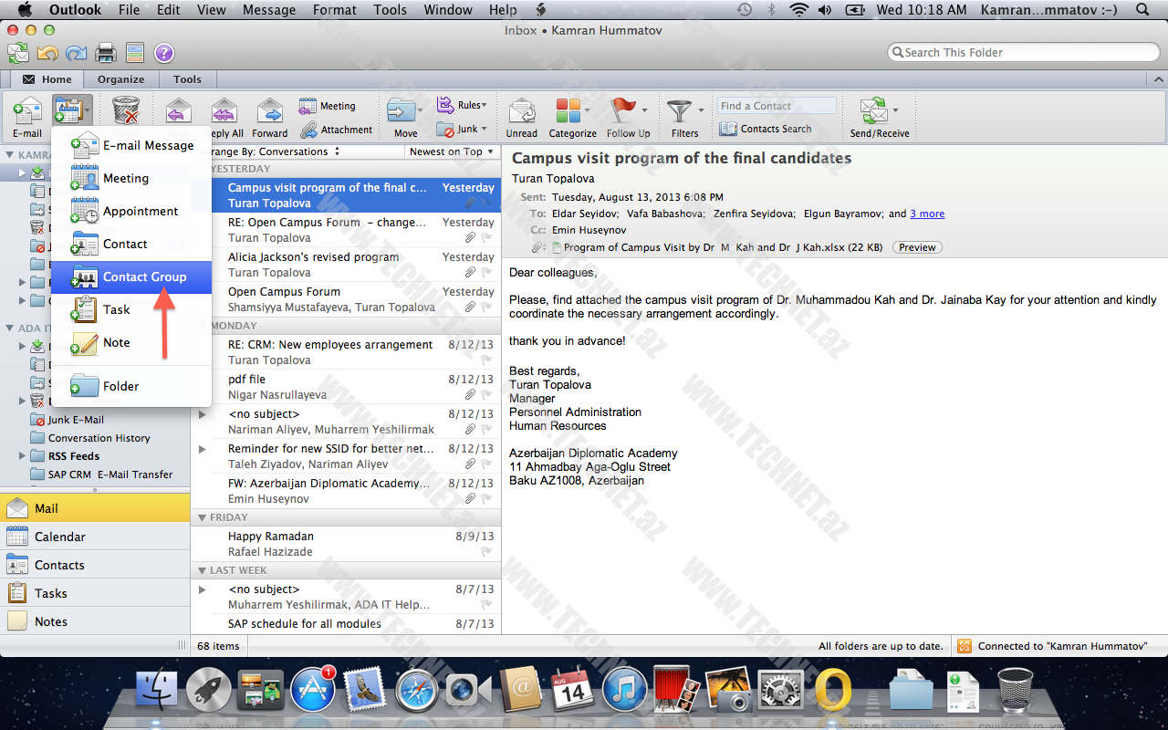 Əziz dostlar bu günki məqaləmizdə MAC OS Microsoft Office 2011 Outlook üzərində Contact Group yaratmagı anlatmaga çalışacam bu məqaləmizidə sizlərə test etdiyim şəkillərlə təqdim edəcəm.Qabaqca bilməyənlər üçün Contact Group haqqında məlumat verim.Əziz dostlar düşününki bir təşkilatda çalışırsız yada ev şəraitində bu keçərlidi düşününki her gün bir grup insane her iş sonu mail vasitəsi ilə Raport verməlisiniz bunun ucun her gun bir qrup insanin mail adresini daxil etmek məcburiyyətində qalirsiniz bu zaman Contact Group bizim köməyimizə catır.Contact Group üstünlüyü haqqında qısa məlumat verdim .