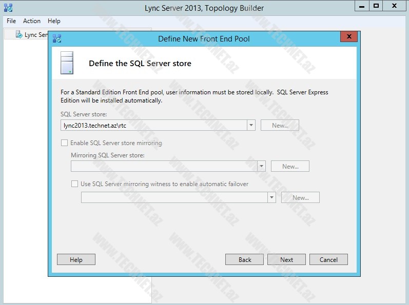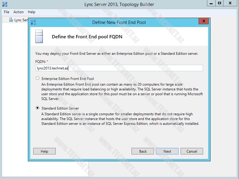 Standard Edition quracağımız üçün “Standard Edition Server” seçirik. “FQDN:” bölümünə isə “Lync” qurduğumuz serverin adını yazırıq.