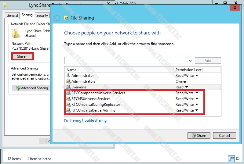 Həmin qruplar şəkildə göstərilmişdir. Biz burada “C” diski üzərində “Lync Share Folder” qovluğu yaratdıq.