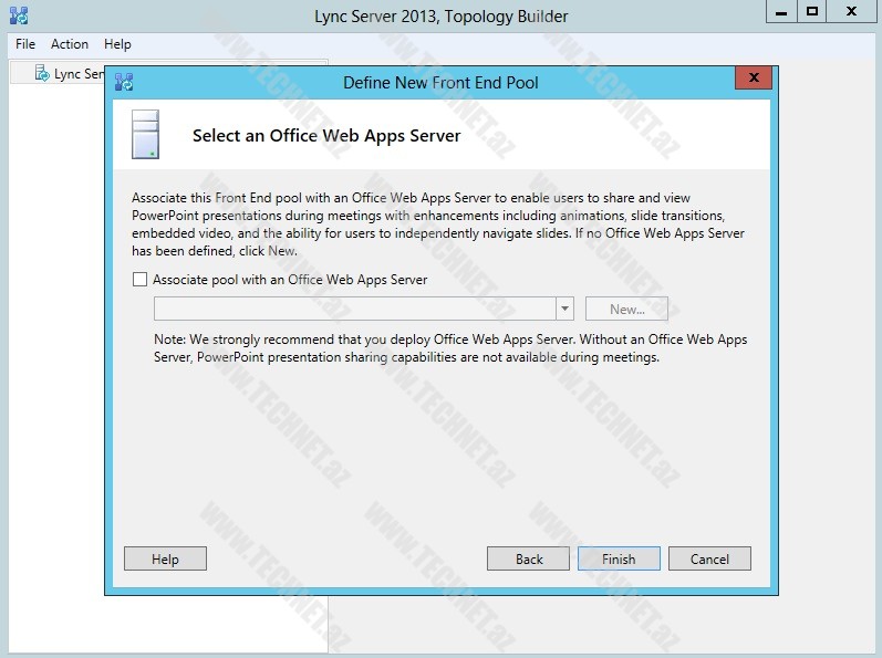 Əgər sistemimizdə “Office WebApps Server” varsa, “New” düyməsini sıxaraq həmin serverin ünvanını daxil edib “Lync” serverlə inteqrasiyasını təmin edə bilərik. Əks halda “Finish” deyərək yekunlaşdırırıq.