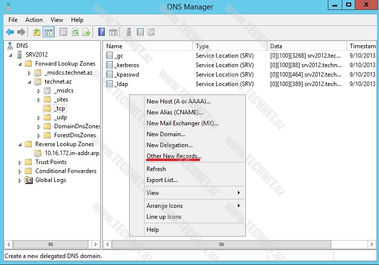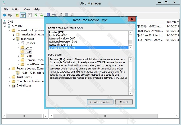 Bunun üçün “DNS Manager” açırıq. Burada server adı altında “Forward Lookup Zones” ->”_tcp” bölməsi altında “Service Location (SRV)” record yaradırıq.