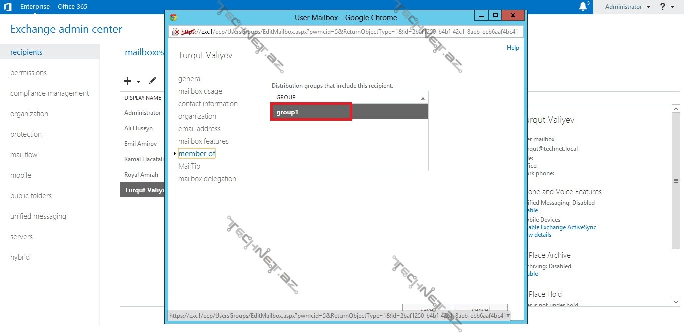 Artıq “groups” başlığı altında yaratdığımız qrup və təyin edilmiş mail ünvanı görülməkdədir. Biz bu qrupa iki istifadəçi əlavə etmişdik: “Turqut Valiyev” və “Royal Amrah” adlı istifadəçiləri.