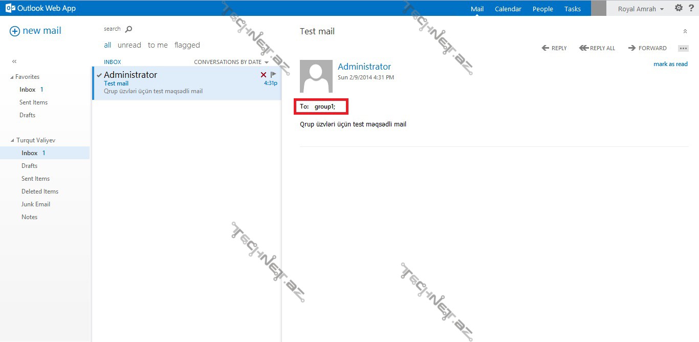 “Administrator” istifadəçimizlə yaratmış olduğumuz qrupa mail göndərdik. Gördüyümüz kimi göndərilən mail qrupa üzv etdiyimiz istifadəçilərə çatdırıılmışdır.