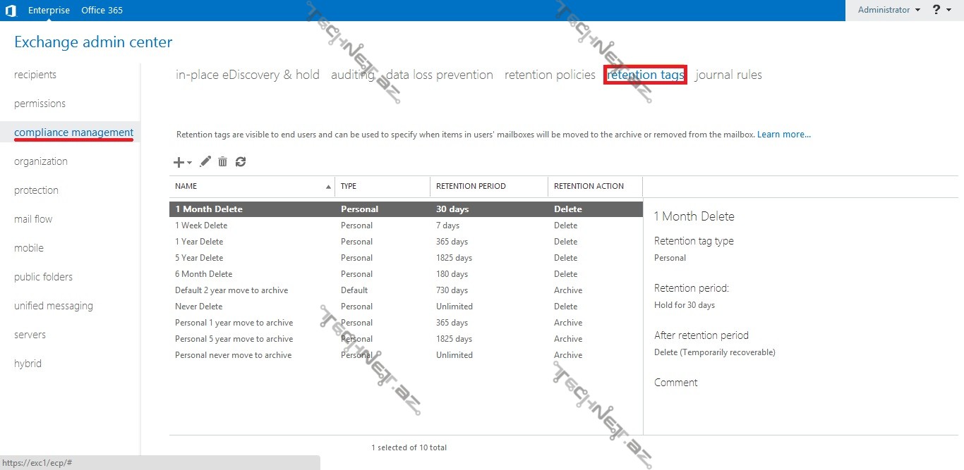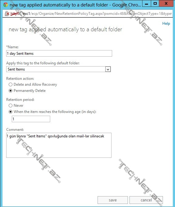 “Retention policies” sayəsində bir mail qutusunda olan bəzi obyektlərə saxlama qaydaları tətbiq edə bilirik. Yəni bu qaydanı tətbiq edərək mail qutusunda olan obyektlərin nə zaman silinəcəyini və ya nə zaman arxivə göndəriləcəyini təyin edirik. Bu qaydalar mail qutularının həddən artıq dolmasından və lazımsız maillərin maneələrindən Bizləri qoruyacaqdır.