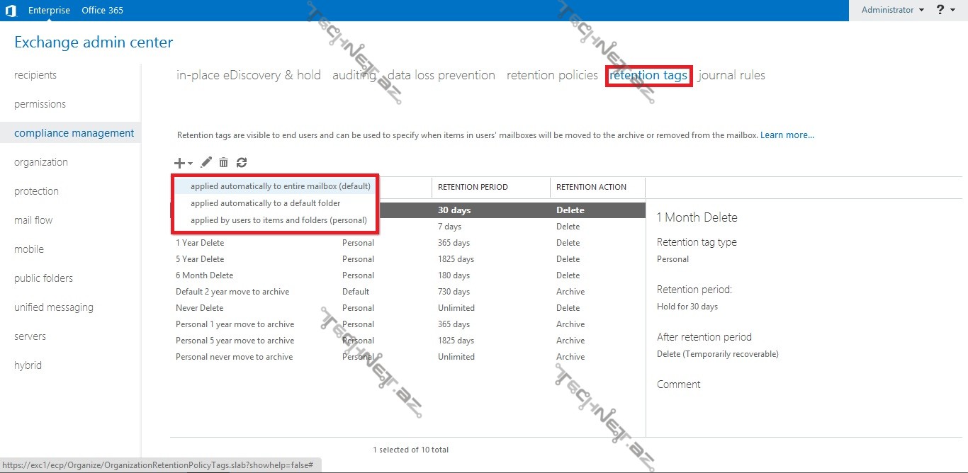 1. “applied automatically to entire mailbox (default)” (Default Policy Tags) – “Mailbox” daxilində bütün obyetklərə tətbiq olunur.