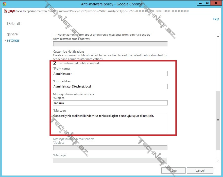 “Create customized notifications text to be used in place of the default notification text for sender and administrator notifications” – Göndərən və Administrator bildirişləri üçün standart bildiriş əvəzinə istifadə ediləcək mətni yazın.