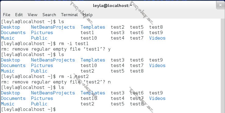 - rm -i <faylın adı> – faylı soruşaraq silir. Sizdən faylı silib-silmıdiyinizi soruşmaq istəyərkən əgər silmək istəyirsinizsə y, istəmirsinizsə N cavabını verin ve ENTERi sıxın.