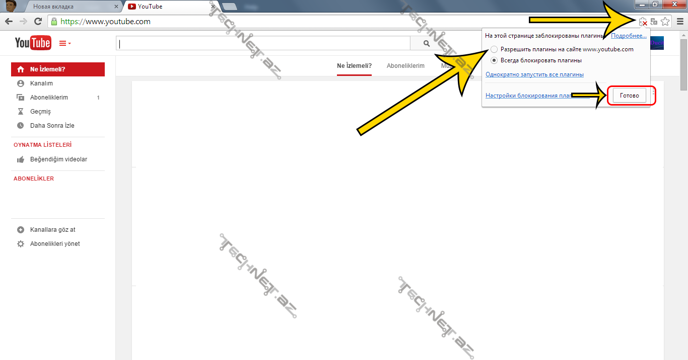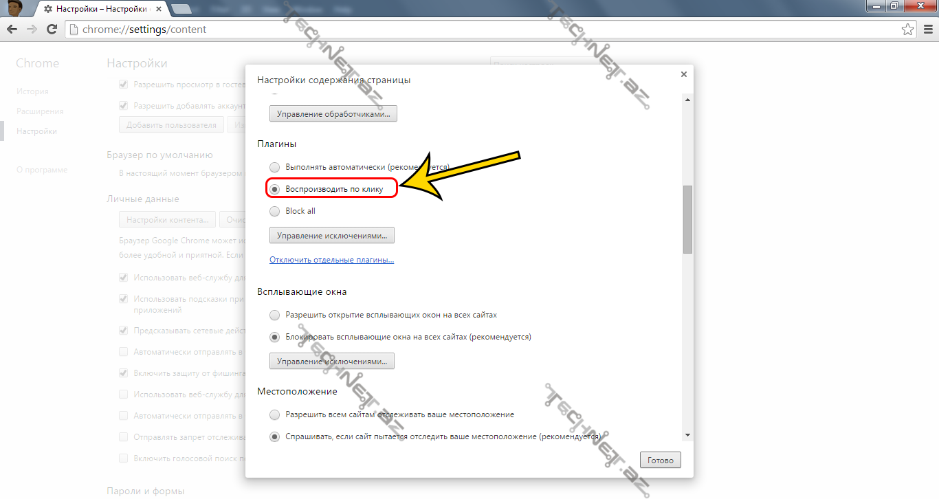 Və artıq istədiyimiz pəncərə açılacaqdır. Burada bütün əlavələri, qoşmaları yalnız icazə istənildikdən sonra işləməsini düzənləyə bilərik. Bunun üçün olduğumuz səhifədə (bizim halda Rus dilində) “Плагины” (Palgins, qoşmalar) altbaşlığında göstərilən seçimlərdən birini, bizim halda lazımlı qoşmaların yalnız icazə ilə işləməsini təmin etmək üçün “Воспроизводит по клику” sətrinin önünə işarə qoyuruq: