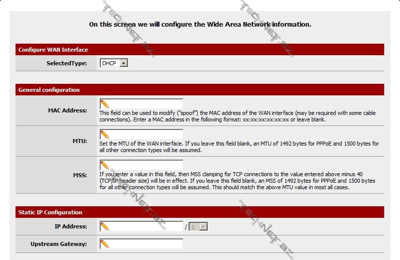 Burada iki hal ola bilər. Əgər “WAN” interfeys “IP” ünvanını DHCP-dən götürəcəksə, DNS server daxil etməyimizə ehtiyac olmaz, çünki “dns” də avtomatik təyin olunacaq. Yox əgər provayderdən statik “ip” ünvanı alırıqsa, bu zaman “dns” ünvanını da daxil etməliyik.