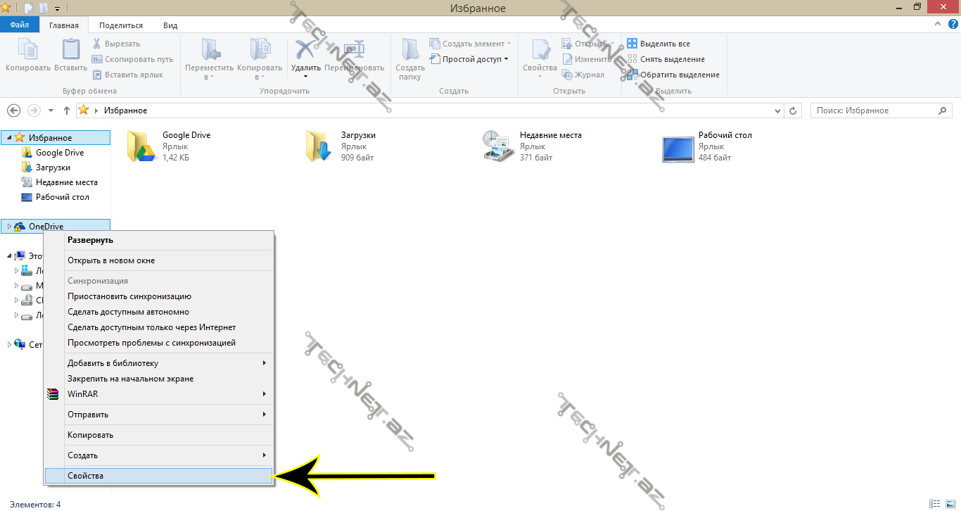 Windows Bələdçisini və ya hər hansı qovluğu açın və quraşdırılmış OneDrive qısayolunun üzərinə mausun sağ düyməsini klikləyin. Açılmış kontekst menyuda “Xüsusiyyətlər” (“Properties”, “Свойства” (bundan sonra Rusca)) seçin.