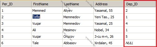 Lakin sualımıza diqqət yetirsək görərik ki, bizdən tələb olunan yalnız əməkdaşlarımızın və çalışdıqları departamentin adlarıdır, yəni cədvəllərdə olan ünvan və digər parametrlər tələb olunmur. Sual belə idi: əməkdaşlarımız hansı departamentlərdə çalışırlar? Yəni əməkdaşların adını, soyadını və çalışdıqları departamenti ekranda göstərin. Nəticədə alırıq: