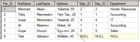 Nəticəmizdə altı sətir və ya element var. Tale Abbasov əməkdaşın qarşısında NULL qiyməti var və görmədiyimiz bir element – “Finance” departamentidir. Səbəbi isə çox sadədir: Tale Abbasovun heç bir departamentdə çalışmır və “Finance” departementində heç bir əməkdaş çalışmır.
