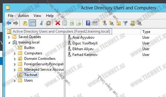 Aşağıdakı şəkillərdə training.local və course.local domainləri var. Biz training.local üzərində olan istfadəçiləri qarşı tərəfə yəni course.local domainə köçürdəcəyik.