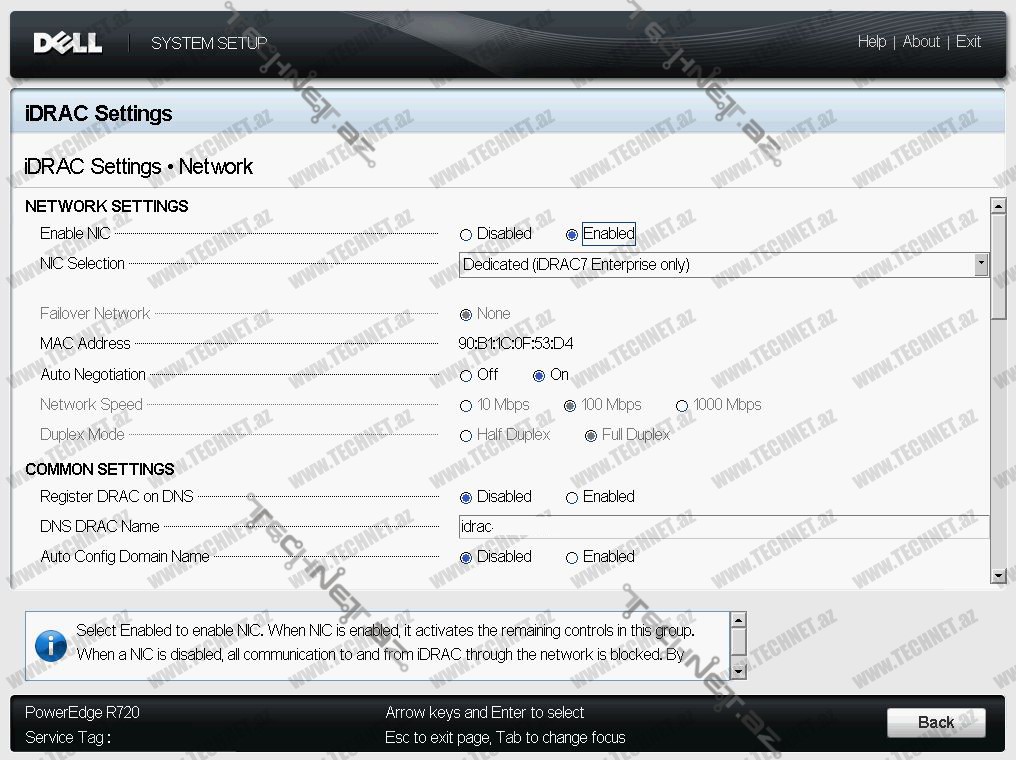 Burada gördüyünüz kimi əgər NIC Disable vəziyyətdədirsə, bunu Enable edirik. Digər hissələri olduğu kimi saxlayırıq. “DNS DRAC Name” hissəsində istədiyimiz adı verə bilərik, mən olduğu kimi saxlayıram.