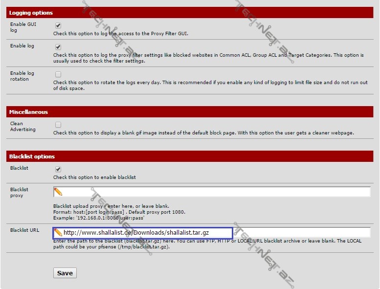 “Blacklist options” bölümü bizə kateqoriyalarda köməkci olacaq bir hissədi. İlk olaraq “Blacklist” qutucuğu işarələnir və “URL” sahəsinə “http://www.shallalist.de/Downloads/shallalist.tar.gz” keçidi əlavə olunur. Bu o deməkdir ki, “SquidGuard” bəzi səhifə kateqotiyalarını (hansı ki zərərli ola biləcək) göstərmiş olduğumuz keçiddən yükləyəcək. “Save” deyirik. Və yuxarıda göstərmiş olduğumuz şəkildə, “Enable” qutucuğunu işarələyib “Apply” düyməsini sıxırıq.