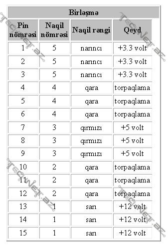 QEYD: -5 (Ağ) və -12 (Mavi) yeni bilgisayarlarda demək olar ki, lazım deyil. -12 və +12 V COMport (Serial), -5 isə Floppy Disk Drive və İSA Bus Card kimi köhnəlmiş avadanlıqlar üçün istifadə edilirdi. Bunlardan bu gün demək olar ki, istifadə olunmur. COM Port (DB9) Switchlərin sazlanmasında istifadə edilsədə, adətən USB to COM istifadə olunur.