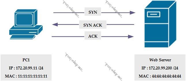 HTTPS protokolu TCP-dən istifadə etdiyi üçün əvvəlcə TCP three-way handshake baş tutmalıdır. TCP three-way handshake zamanı məlumat mübadiləsini başlamaq istəyən tərəf (bu misalda PC1) Web Server-ə SYN (synchronize) göndərir və bununla əlaqə qurmaq istədiyini bildirir. Əgər Web Server-də tələb olunan xidmət (bu misalda HTTPS) aktivdirsə, onda Web Server cavab olaraq SYN ACK göndərir. Burda ACK (acknowledgement) PC1 tərəfindən göndərilən SYN-ə cavabdır və öz növbəsində Web Server də SYN göndərir. Son olaraq isə PC1 qəbul etdiyi SYN-ə cavab olaraq ACK göndərir və bununla TCP three-way handshake başa çatmış hesab olunur. Bu prosesdən sonra artıq PC1 HTTPS sorğularını Web Server-ə göndərə bilər.