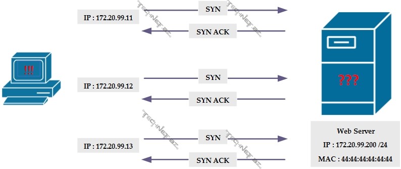 Yuxarıda qeyd olunan proses adi qaydada baş tutur, amma şəbəkəmizə hücum etmək istəyənlər IP spoofing edib, çoxlu sayda yarımçıq TCP əlaqə qurub, Denial of Service həyata keçirə bilərlər. Daha aydın olsun deyə təsəvvür edin ki, PC1 başqa istifadəçilərin IP-ləri ilə Web Server-ə SYN göndərir. Web Server adi qaydada SYN ACK cavabını göndərib həmin IP-lərdən son ACK-i gözləyir. Bu dəfə həmin IP-lər Web Server tərəfindən göndərilən SYN ACK-i cavabsız qoyur, çünki onlar ilkin olaraq SYN göndərməyiblər (onların əvəzinə bunu PC1 edib). Bununla Web Server-də çoxlu sayda yarımçıq TCP əlaqə qurulur və istənilər serverdə bu növ əlaqələrin qurulma sayı məhdud olduğuna görə, müəyyən zamandan sonra sözügedən Web Server ümumiyyətlə TCP SYN sorğularına cavab verə bilməyib, xidmətini dayandıracaq (Denial of Service). Bu növ hücumlara SYN flood deyilir.